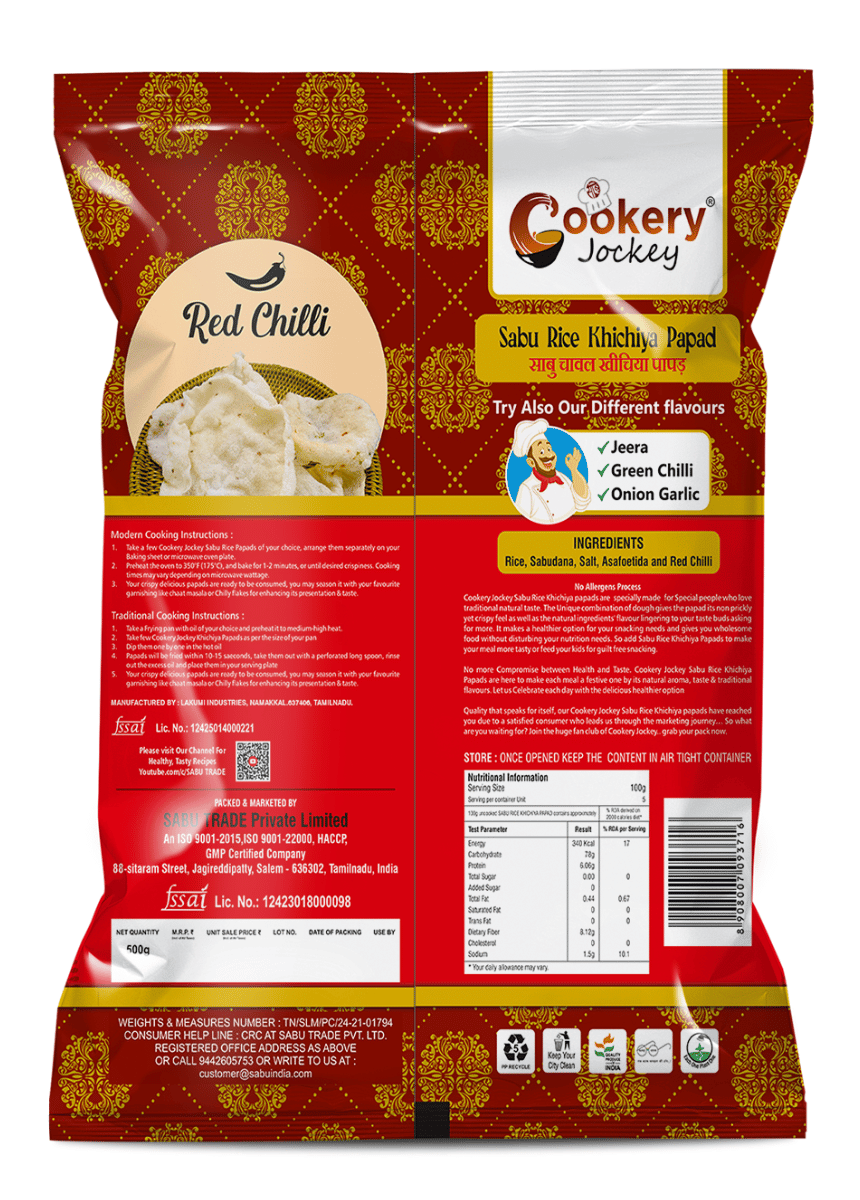 Cookery Jockey Sabu Rice Khichiya Red Chilli papads are specially made for Special people who love Traditanal natural taste. The Unique combination of dough gives the papad its non prickly yet crispy feel as well as the natural ingredients flavour lingering to your taste buds asking for more. It makes a healthier option for your snacking needs and gives you wholesome food without disturbing your nutrition needs. So add Sabu Rice Khichiya Papads to make your meal more tasty or feed your kids for guilt free snacking. The unique combinational of Deep fry the Papadums for the crispiest results found in the Image, Yummy and Crunchy Papadums Ready to Fry.